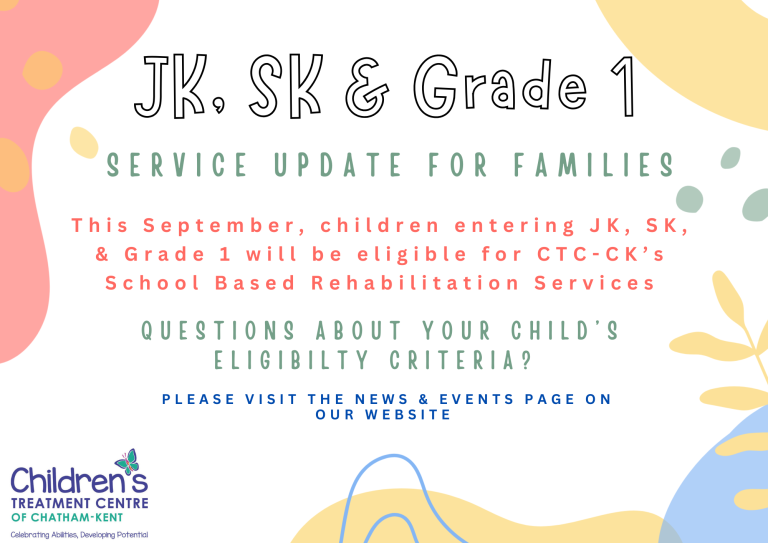 Following our Ministry directives, we are making an important change to support children as they start school and move through the school years. Currently, all students in JK and SK at publicly funded schools are supported through the CTC-CK’s Community-Based Rehabilitation Services…